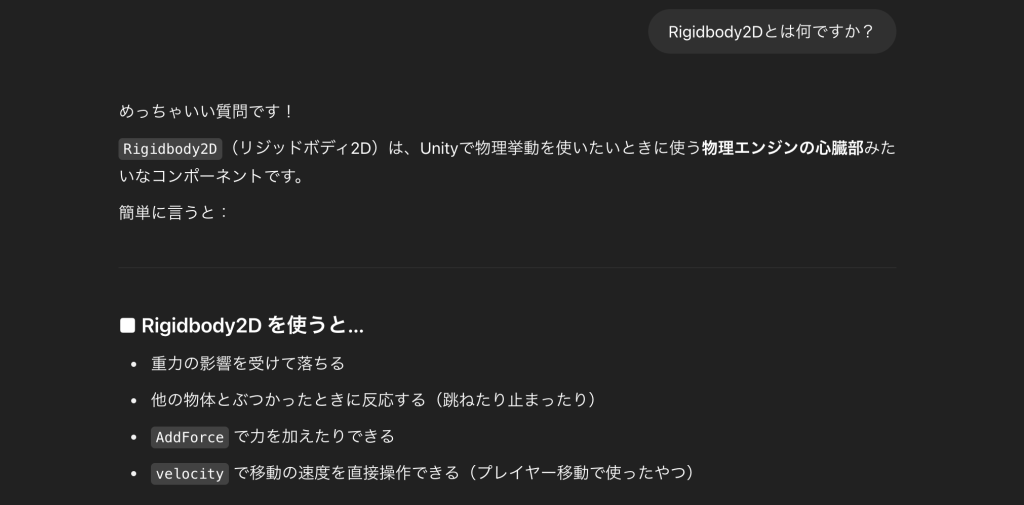 さらに、実装途中で聞きなれない言葉があれば、ググるよりもそのままChatGPTに聞いてみるとすぐに返事が返ってきて、普段エンジニアの方にも手間をかけさせちゃうような質問も手軽に聞けるのがめちゃくちゃ良かった。