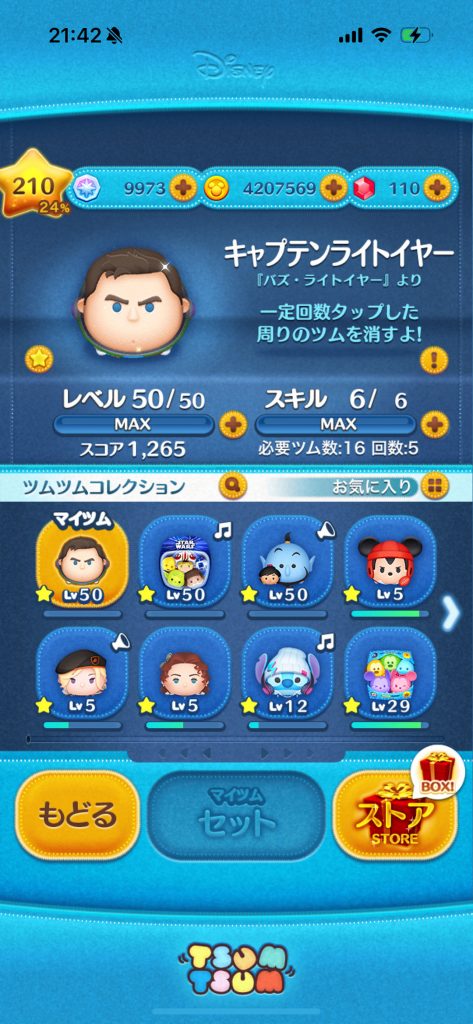 所持しているツムが2×4のリストで表示され、選択中のツムが画面上部に表示されます。