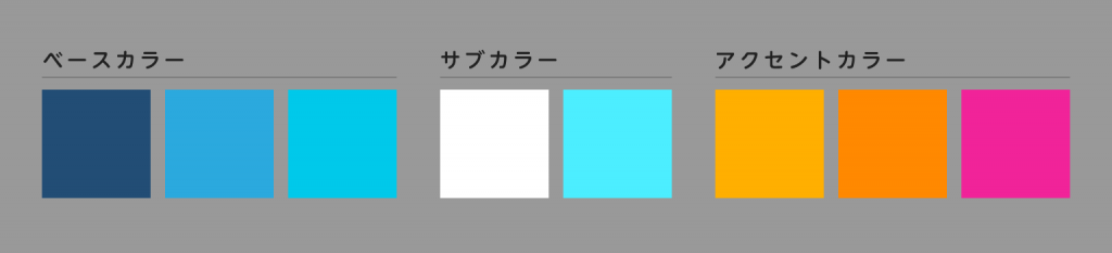 全体の色味として青系の色味をベースに使用し、黄色やピンクなどの華やかな色ではっきりとしたアクセントカラーが使われています。
